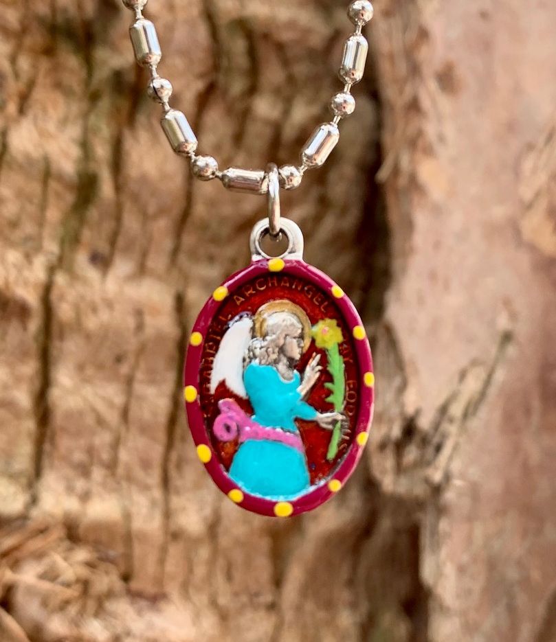 Gabriel was the Angel who visited with Saint Joseph (pictured above, at his workbench and also with the lily, two of his emblems). We also have great cards of Joseph, one where he's at his workbench, and the other with Joseph asleep and Arch Angel Gabriel waking him up with Good News about Mary. We found the cards in Rome and will send both with every order. Gabriel quietly let Joseph know Mary had experienced the Immaculate Conception. That must have been a bit confusing in the beginning. Now, Gabriel is very well known as the "Messenger" and, I guess he's the patron of text messaging too. Kids must love Arch Angel Gabriel since they seem to be texting pretty frequently, unlike me, who still texts with two fingers. I guess kids should chat with Arch Angel Gabriel when they are waiting to get the SAT scores! Hmmmm - a kind of clever way to get kids interested in spirituality! That's good news too!