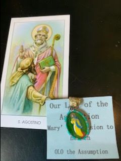 The www.SaintsforSinners.com Assumption of Mary medal can be seen below along with the Saint Agostino prayer card from Italy.