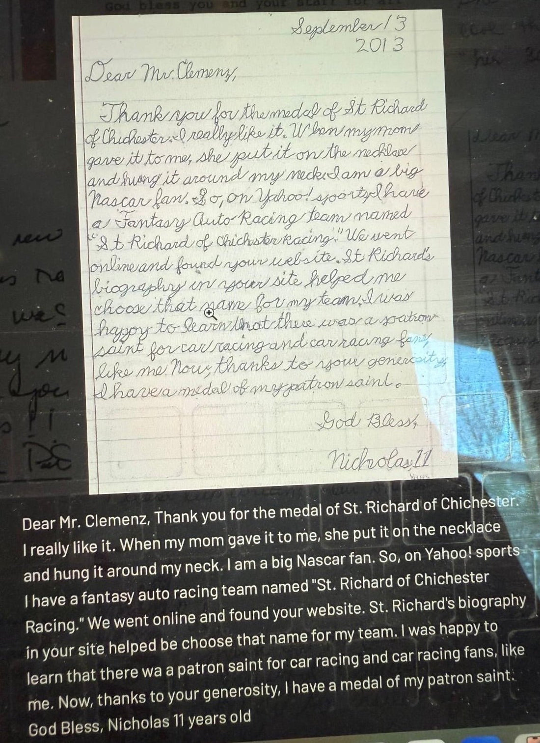 Nicholas, you're a grown man now! I hope you are well and happy. Please know that your 11 year old self touched my heart deeply. Your note (written in script!) has picked me up over and over again. Your words always encourage me. You strengthened my resolve to reach out to people lapsed a bit. I'm not "preaching to the choir." You inspired my creativity when you simply accepted we have a patron saint for NASCAR drivers.
