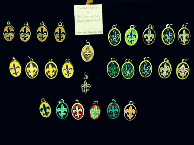 " Stop the Presses " - We Have Big News! We are finally re-introducing our new and improved Fleur-De-Lis designs at www.SaintsforSinners.com. It is and was originally a Holy Spirit medal, "disguised" as a fleur-de-lis in various colors; including, black and gold, purple and yellow or gold, green and white, etc... and they can be customized to complement your personal style or you could get them in the colors of your favorite sports teams, schools and the like. There will also be a substantial discount for bulk orders. We love having the Holy Spirit in the fleur-de-lis, because, as we all know the Holy Spirit is in all things!