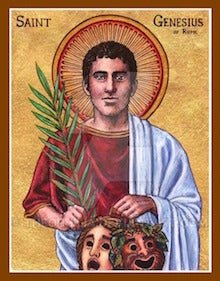 Genesius’ story took place long ago. He was a notary for Emperor Diocletian who assigned Genesius the task of reading edicts to the people. One day, while reciting the Edict of the Day, Genesius became disgusted at its content, threw the document in the sewer and quit his job. For this, he was beheaded. As time passed, so did the story about Genesius. The spin doctors made up stories about Genesius as an actor in a play, a satire about Christianity. The “tour-de-force” was a parody that the Emperor enjoyed because it portrayed Christians in an evil way. During a methodical performance, Genesius claimed to be truly converted to the religion of the Christian he was portraying. He stepped out of character and proclaimed: “Jesus Christ is the true Lord.” He was then pulled off the stage, burned at the stake and beheaded. The grossly exaggerated story is certainly more colorful than the true facts, which also seems to be the motto of The National Enquirer. Pray to Saint Genesius when life becomes a play. @2001