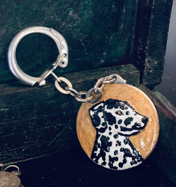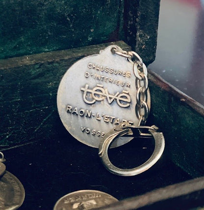 From a French village market, this one-of-a-kind keychain medal seems to be associated with the French shoe company "Teve". Our very own, Franco, added a Dalmation spin to it.