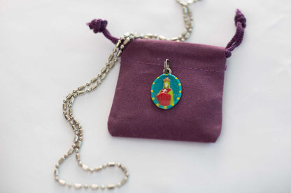 Your order includes our vibrant one-of-a-kind hand-painted saint medal, a silver necklace, keychain clasp, or Sterling Silver necklace (your choice!), the story of Our Lady in greeting card format, a felt pouch for safekeeping, unique prayer cards from Rome, Italy, an extra envelope for easy mailing or gifting and a money back guarantee, “No Questions Asked.” Rob and SaintsforSinners.com stand by their work product. The stories are sometimes embellished, paraphrased, or updated, but overall, they retain the theme presented at canonization or veneration.