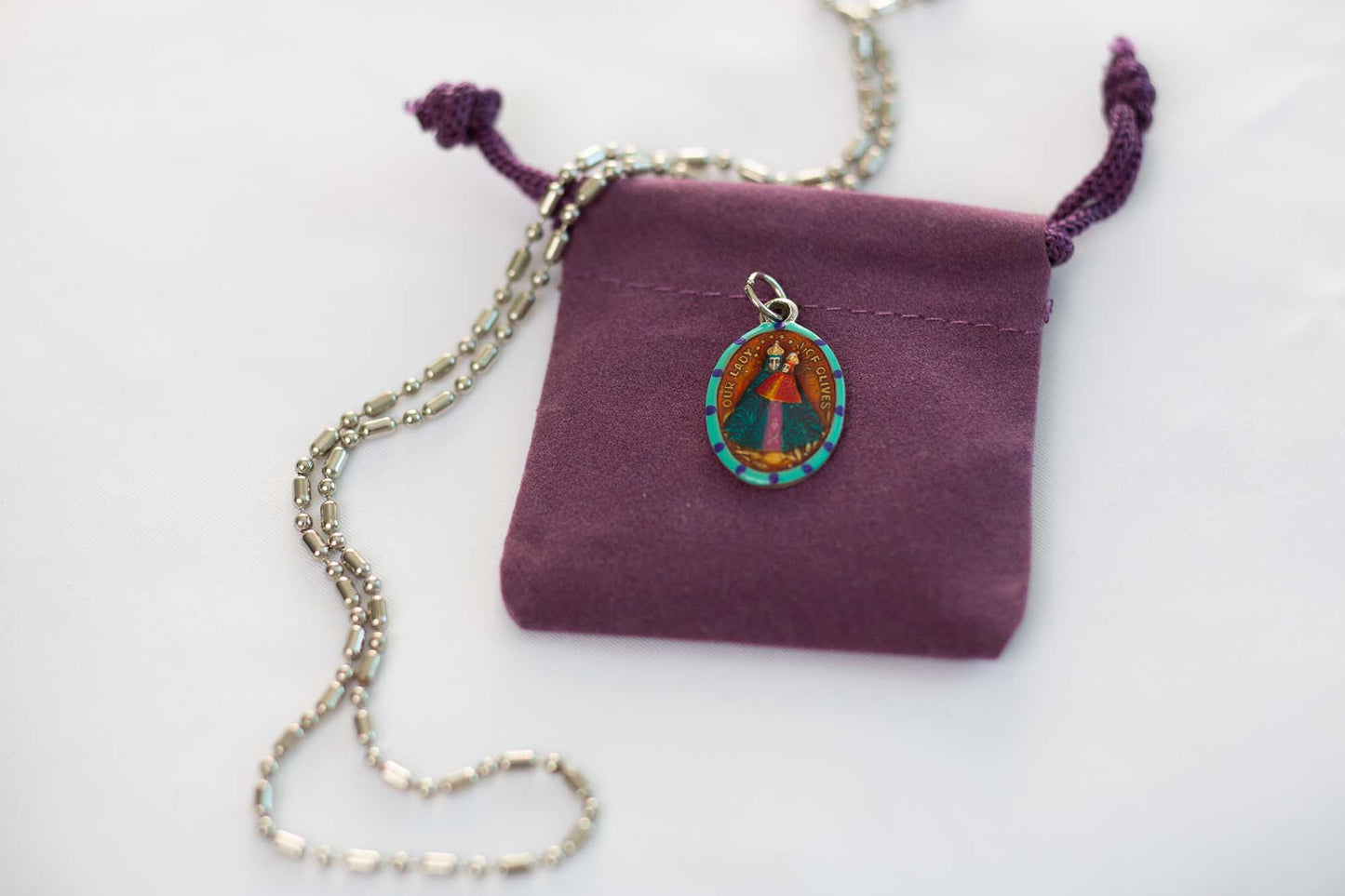 Your order includes our vibrant one-of-a-kind hand-painted saint medal, a silver necklace, keychain clasp, or Sterling Silver necklace (your choice!), the story of Our Lady in greeting card format, a felt pouch for safekeeping, unique prayer cards from Rome, Italy, an extra envelope for easy mailing or gifting and a money back guarantee, “No Questions Asked.” Rob and SaintsforSinners.com stand by their work product. The stories are sometimes embellished, paraphrased, or updated, but overall, they retain the theme presented at canonization or veneration.