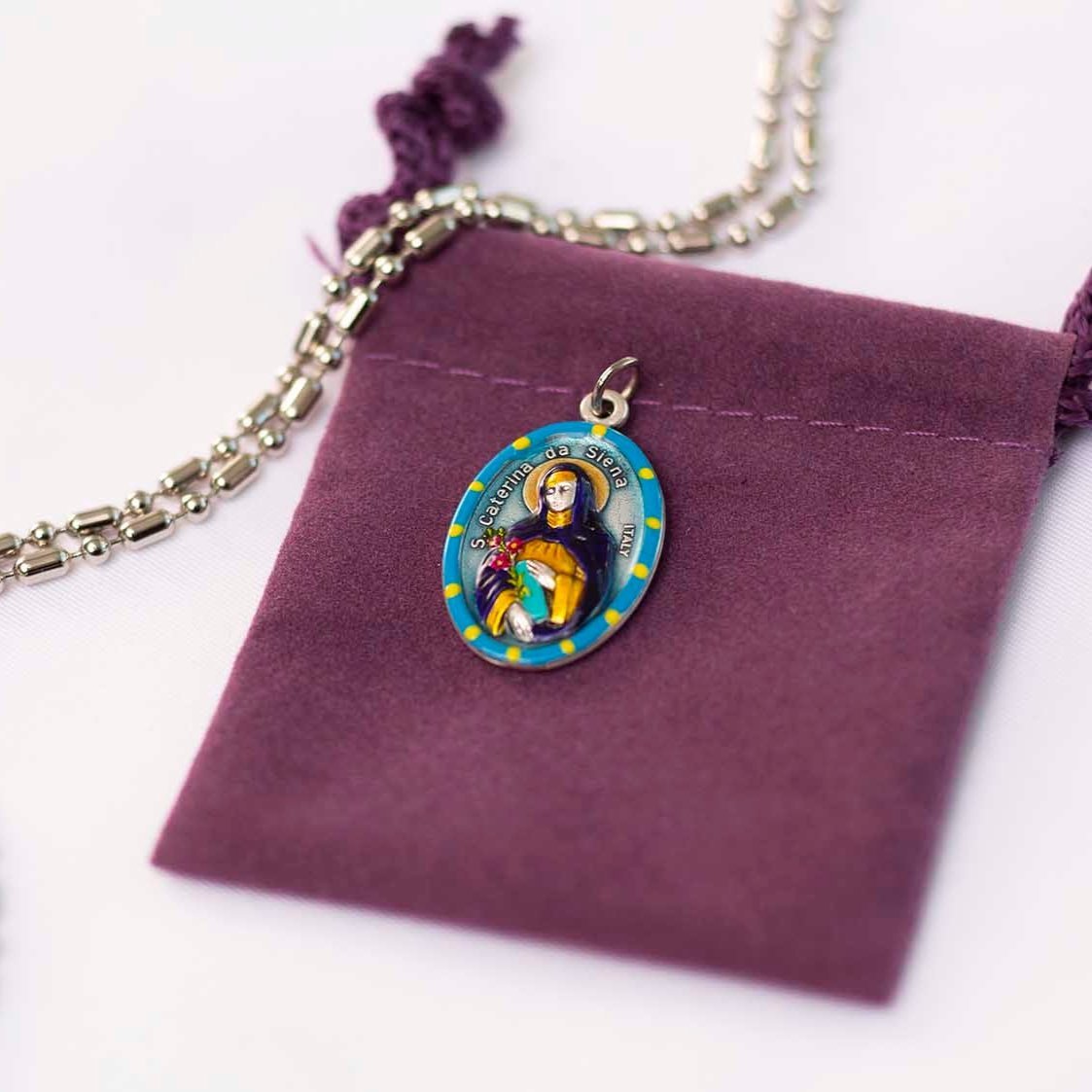Your order includes our vibrant one-of-a-kind hand-painted saint medal, a silver necklace, keychain clasp, or Sterling Silver chain (your choice!), the story of Saint Catherine of Siena in greeting card format, a felt pouch for safekeeping, unique prayer cards from Rome, Italy, an extra envelope for easy mailing or gifting and a money back guarantee, “No Questions Asked.” Rob and SaintsforSinners.com stand by their work product. The stories are sometimes embellished, paraphrased, or updated, but overall, they retain the theme presented at canonization or veneration.
