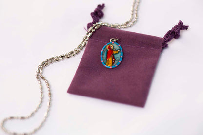 Your order includes  our vibrant one-of-a-kind hand-painted saint medal, a silver necklace, keychain clasp, or Sterling Silver necklace (your choice!), the story of Saint Genevieve in greeting card format, a felt pouch for safekeeping, unique prayer cards from Rome, Italy, an extra envelope for easy mailing or gifting and a money back guarantee, “No Questions Asked.”  Rob and SaintsforSinners.com stand by their work product. The stories are sometimes embellished, paraphrased, or updated, but overall, they retain the theme presented at canonization or veneration.