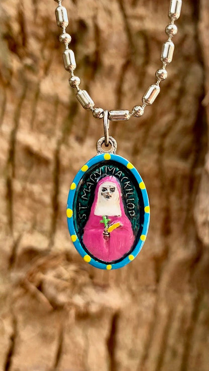 Your order includes our vibrant one-of-a-kind hand-painted saint medal, a silver necklace, keychain clasp, or Sterling Silver necklace (your choice!), the story of Saint Mary MacKillop in greeting card format, a felt pouch for safekeeping, unique prayer cards from Rome, Italy, an extra envelope for easy mailing or gifting and a money back guarantee, “No Questions Asked.” Rob and SaintsforSinners.com stand by their work product. The stories are sometimes embellished, paraphrased, or updated, but overall, they retain the theme presented at canonization or veneration.