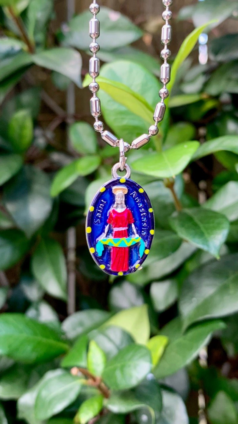 Your order includes our vibrant one-of-a-kind hand-painted saint medal, a silver necklace, keychain clasp, or Sterling Silver chain (your choice!), the story of Saint Anastasia in greeting card format, a felt pouch for safekeeping, unique prayer cards from Rome, Italy, an extra envelope for easy mailing or gifting and a money back guarantee, “No Questions Asked.” Rob and SaintsforSinners.com stand by their work product. The stories are sometimes embellished, paraphrased, or updated, but overall, they retain the theme presented at canonization or veneration.