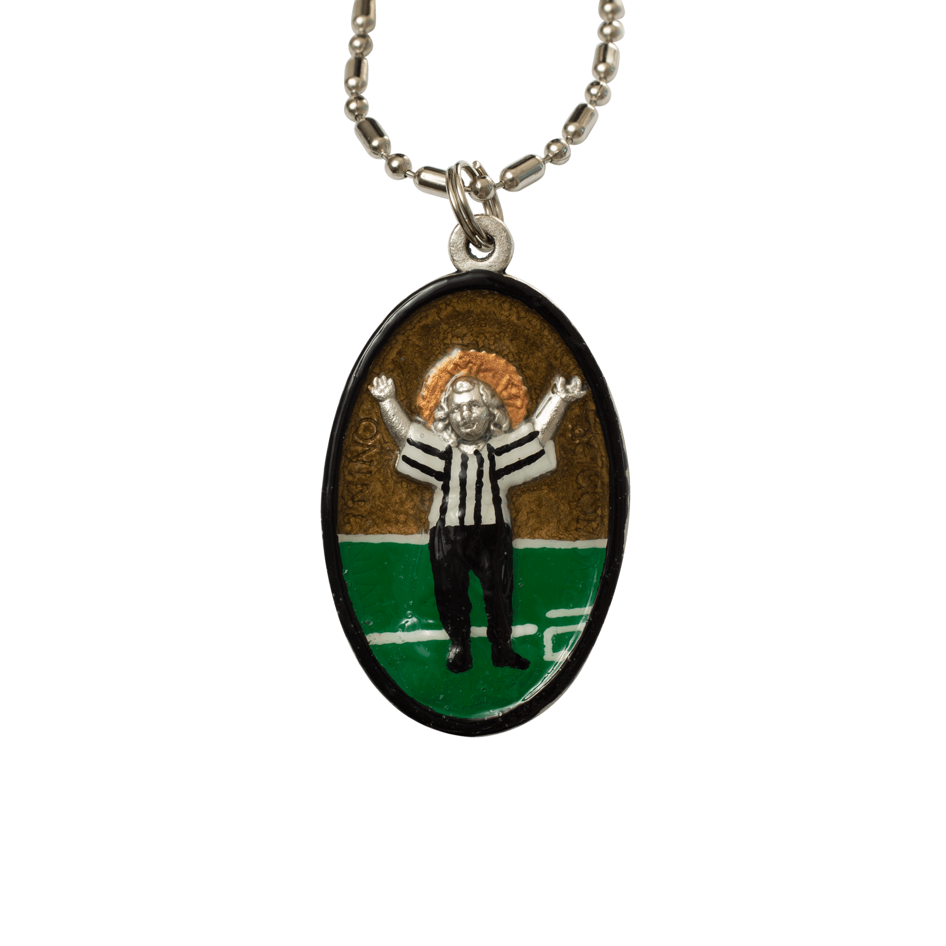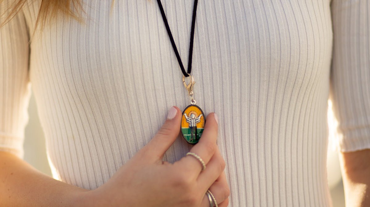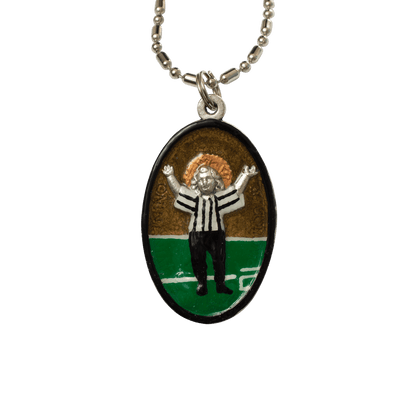 Touchdown Jesus, patron of Notre Dame University, is a mural by artist Millard Sheets, located at the Hessburg Library on campus in Indiana. Invoke Touchdown Jesus when cheering on your favorite football team, whichever it may be! On game days, make sure to wear your Touchdown Jesus medal—you’ll want him on your team’s side.