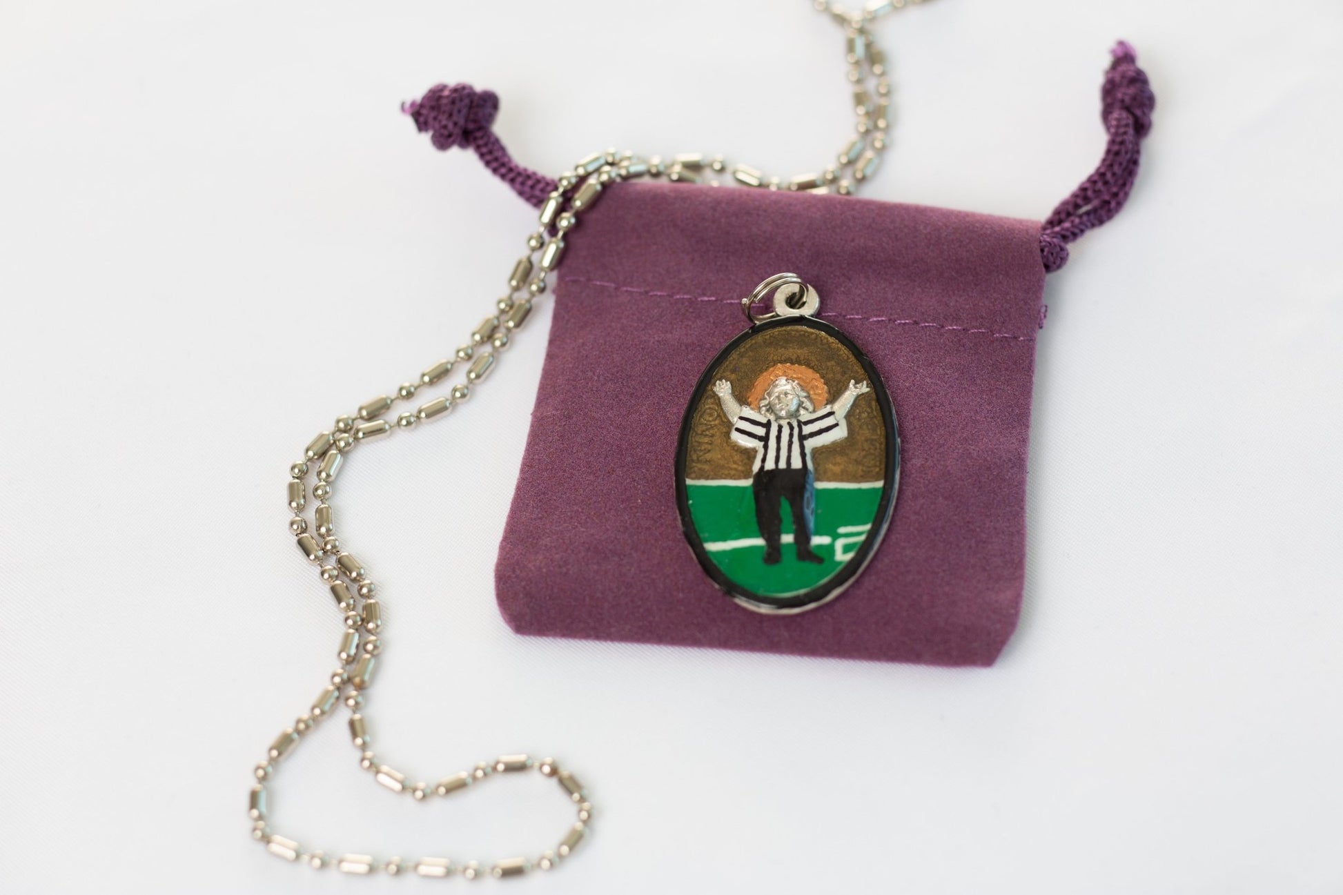 Your order includes our vibrant one-of-a-kind hand-painted saint medal, a silver necklace, keychain clasp, or Sterling Silver necklace (your choice!), the story of Touchdown Jesus in greeting card format, a felt pouch for safekeeping, unique prayer cards from Rome, Italy, an extra envelope for easy mailing or gifting and a money back guarantee, “No Questions Asked.” Rob and SaintsforSinners.com stand by their work product. The stories are sometimes embellished, paraphrased, or updated, but overall, they retain the theme presented at canonization or veneration.